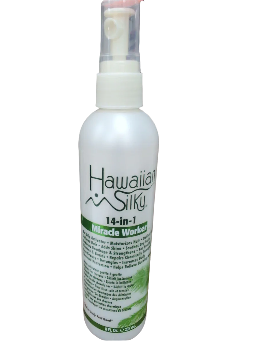 Hawaiian Silky 14-in-1 Miracle Worker provides an all-in-one solution for healthy hair and skin. With no-drip activator, it moisturizes, adds shine, soothes dryness, and strengthens for reduced breakage. Perfect for maintaining healthy weaves and braids. Unlock the miracle of Hawaiian Silky for your hair and skin.
